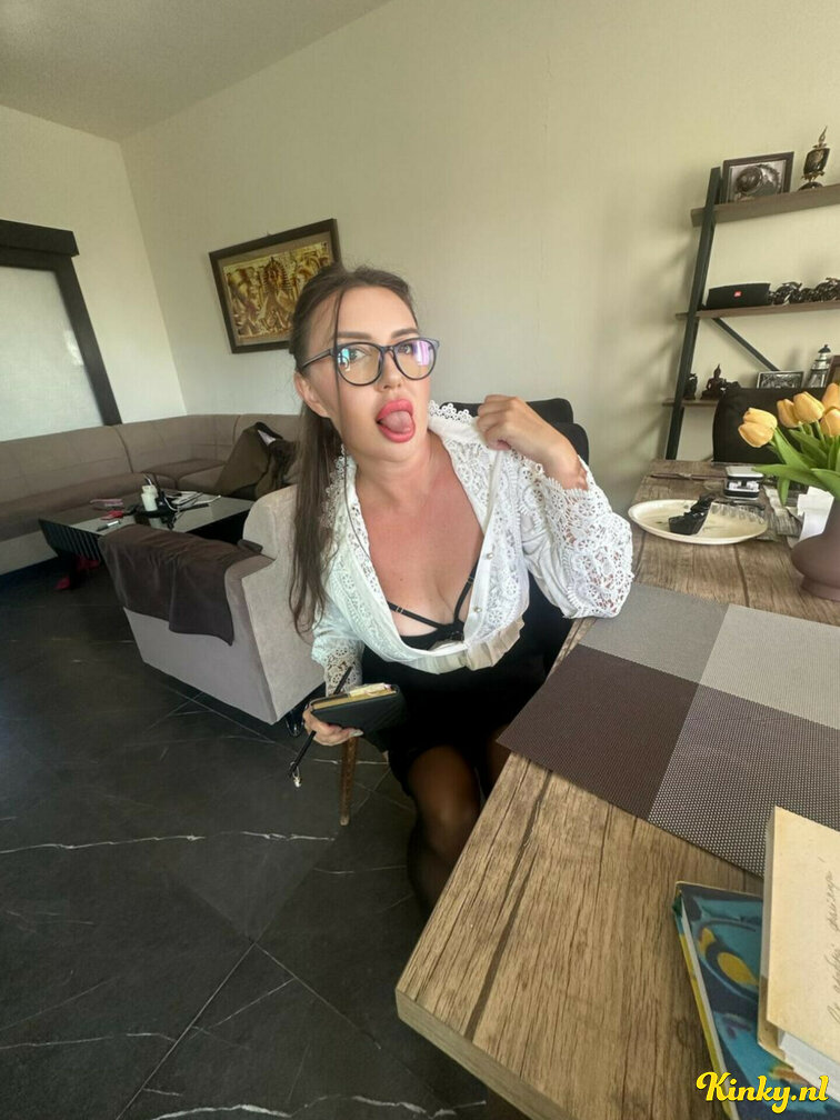 She welcomed me dressed as a sexy secretary – tight skirt, glasses, heels – like in the picture. I was hard the second I walked in. The roleplay was spot-on and super hot.